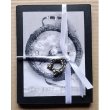 The black envelope is in embossed cardboard (300 grams) with a leather-like effect, and is closed by a withe ribbon on which is inserted a metallic flower crown.