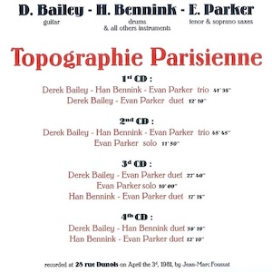 Now that we've cleared with room of runners, let those that remain rejoice in a rare recording of these improvisation masters together. Besides Topographie Parisienne there is only the seminal trio recording The Topography Of The Lungs (Incus, 1970), which would later be a reissued CD by psi in 1986 and LP from Otoroku in 2018. Various duos can be found, Bailey/Parker's The London Concert (psi, 2005) and Arch Duo (Rastascan Records, 1999), Parker/Bennink's The Grass Is Greener (psi, 2002) and Derek Bailey & Han Bennink (Incus, 1972). Where this Paris live date from April 3, 1981 has been is anyone's guess. Needless to say, when you are running into a fire you don't ask questions.