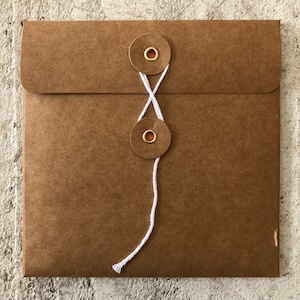 The CD-R is contained in a 13x13 cm brown cardboard archival sleeve. A sticker is placed on the sleeve.