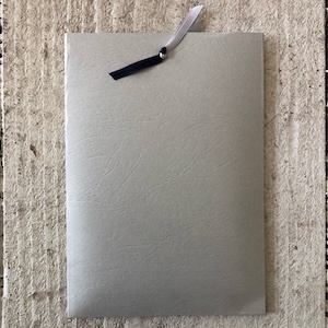 The envelope has a hole closed with two pieces of satin ribbon (grey and blue) holding a charm in silver metal wich represents the symbol of infinity.