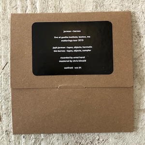 最強コンビの廃盤音源が新パッケージで復刻!!当店がオープン当初から推し続けてるプリミティブ物音の最高峰Jeph Jermanと、氏と抜群の相性の良さで多くの名作を残してきたTim Barnes。オリジナルは同Confrontが2016年にリリース、長らく廃盤となっていた全45分の長編ライブ録音[Goethe]が新たな紙ジャケットにてリイシュー。2015年にマサチューセッツ州はボストンで開催されたイベントでのライブパフォーマンスであり、お互いがテープと物体、そしてサンプラー、ハルモニウム、ツィターを使った珍しい編成での録音ブツ。抑揚のある流れもこのデュオならでは。