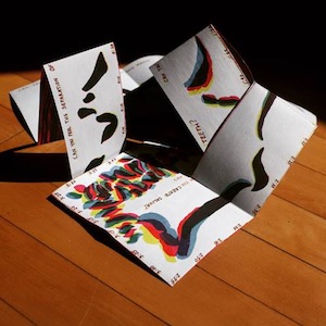Rather than a composition for generating sounds, Anderson's listening scores provide a visual framework for perceiving Genetti's compositions: screen printed marks and text prompt the listener to engage with the audio in different sensory and conceptual ways. Layers of color shift and lose alignment along a trajectory marked in time code as the intricately folded scores emulate the folds of the small intestines.